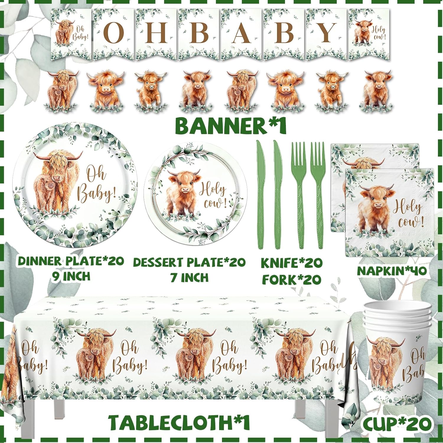 Serves 20 – 1pcs tablecloth-70.8×42.5inch, 20pcs dinner platter-9inch, 20pcs dessert platter-7inch, 1pcs banner -5.51×7.08inch, 40pcs napkins -6.5×6.5inch, 20 pairs of knives and forks, 20pcs cups (90oz) Our Highland Cow Tableware is suitable for 20 people to use.