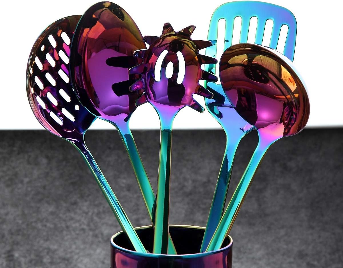 CRAFT: Rainbow kitchen utensil crafted from 304 Stainless Steel, Completed electroplated with titanium Rainbow color , rust proof, high hardness, Lead-free, Cadmium-free, Phthalate-free, BPA-free durable and eco-friendly.