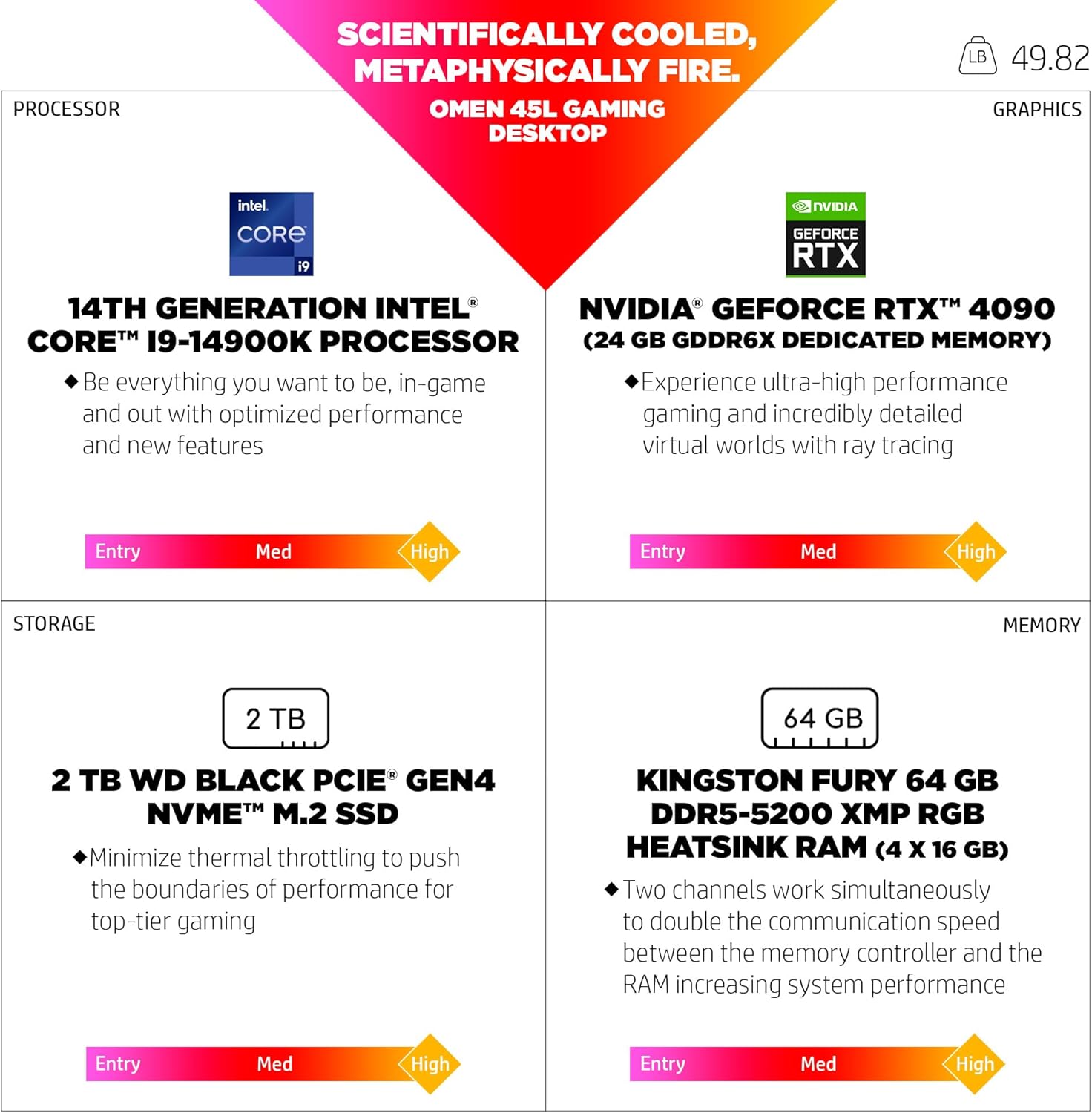 Define the cutting edge with the HP OMEN 45L Desktop PC. Built with a 14th Generation Intel Core i9-14900K processor, dazzling graphics and extreme cooling with the patented liquid-cooled OMEN CRYO CHAMBER cooling system. This gaming desktop is ENERGY STAR certified, EPEAT Gold registered and designed using sustainable materials like water-based paint. The HP OMEN 45L Desktop PC comes with 1-month of Xbox Game Pass Ultimate.1 HP is here to help. This HP computer comes with 1-year limited hardware warranty and 1-year limited technical support for software and initial setup with 24-hour, 7 days a week web support when shipped from and sold by Amazon.com. ENERGY STAR and the ENERGY STAR mark are registered trademarks owned by the U.S. Environmental Protection Agency. Based on U.S. EPEAT® registration according to IEEE 1680.1-2018 EPEAT®. EPEAT® status varies by country. Visit www.epeat.net for more information. 11 month trial offer – Promotional offers may be for new members only and/or not be valid for all members and are only available for a limited time. Credit card and Xbox account required. After promotional period, subscription automatically continues at the then-current regular price (subject to change), unless cancelled, plus applicable taxes. To stop being charged, cancel your subscription or turn off recurring billing in your Microsoft account (account.microsoft.com/services) or on your Xbox console, before the next billing date. For more details, see support.xbox.com/help/subscriptions-billing/manage-subscriptions/cancel-recurring-billing-or- subscription. Purchase of Xbox Game Pass Ultimate automatically upgrades your existing Xbox Live Gold, Xbox Game Pass (PC or Console), and/or EA Play membership(s) to Xbox Game Pass Ultimate at a conversion ratio each based on days remaining. Learn how this works at xbox.com/gamepass. See Microsoft xbox.com/en-US/legal/subscription-terms for more details.