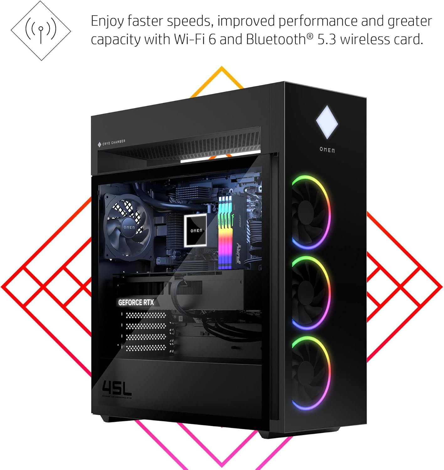OMEN CRYO CHAMBER – Experience revolutionary cooling from the patented OMEN CRYO CHAMBER cooling system that enables the liquid cooler radiator to channel fresh, cold air from the surrounding environment to cool down the CPU