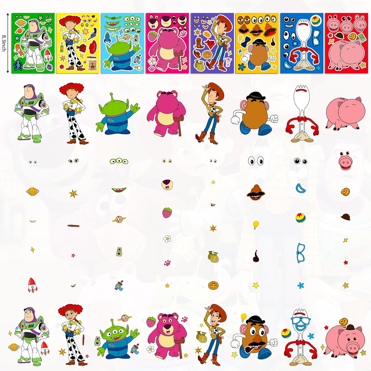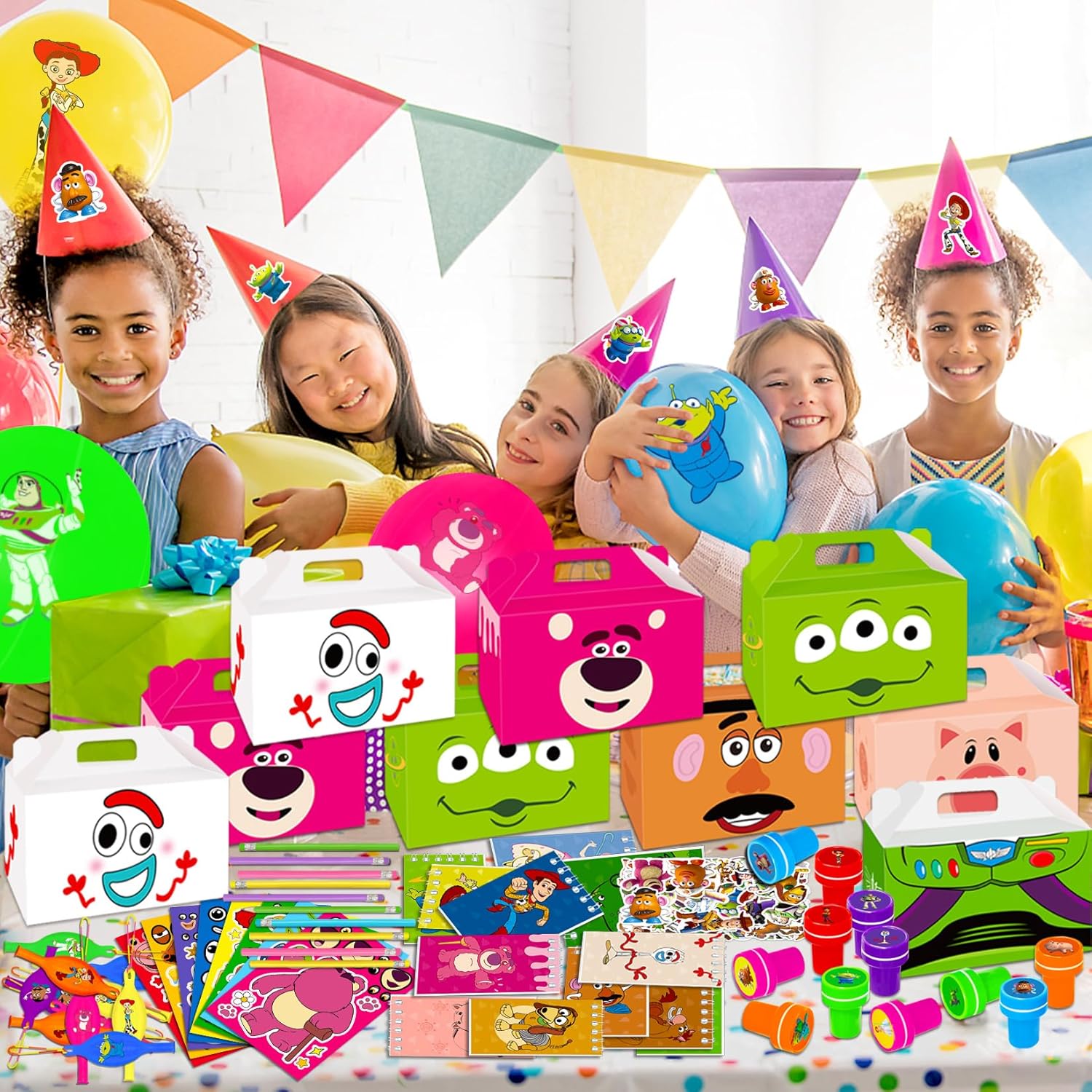 Super Valued Package of toy inspired story toys: 12 toy inspired story gift boxes, 12 pens, 12 balloons, 50 random toy inspired story stickers, 12 notebooks, 12 make a toy inspired story face stickers, 12 stamps,Ideal presents and perfect party favors for kids in celebrations with toy inspired story theme.