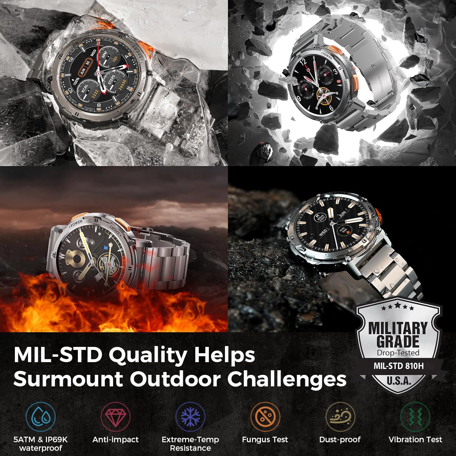 ⌚Military Standard Quality – KOSPET smart watches for men features 1.43” 3rd generation Corning Gorilla screen with a durable 9H dual-glass display, it’s extremely scratch-resistant and can be used in harsh outdoor environments for strenuous activities. TANK T2 carcass is forged out of TC4 titanium alloy, has a hard and tough appearance. The smartwatch is resistant to shock, drop and car crushing. Certified to MIL-STD810H smart watch is suitable for outdoor sports and harsh working environments.
