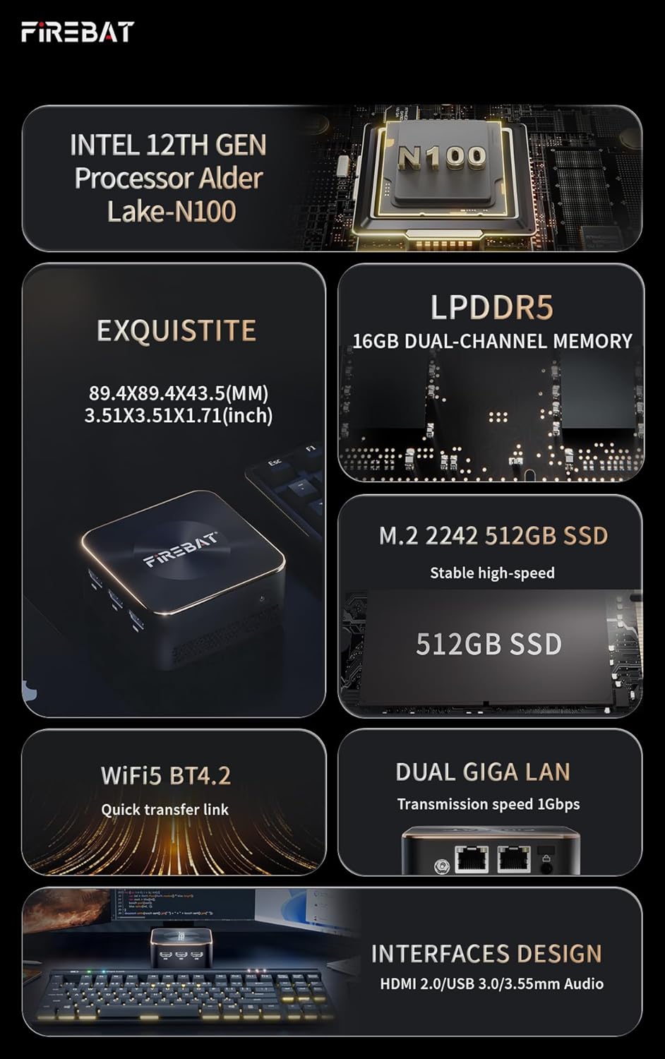 【Intel 12th Gen Alder Lake-N100】FIREBAT T8 Plus Mini PC with 12th Gen Intel Alder Lake-N100 processor (4C/4T, 6M Cache, up to 3.4GHz) and Intel UHD Graphics Processor with Intel 7 Processing Processing, TDW 25W. compared to N5105, N5095, and J4125. Ideal for streaming media, photo editing, office tasks or as a NAS and soft router.