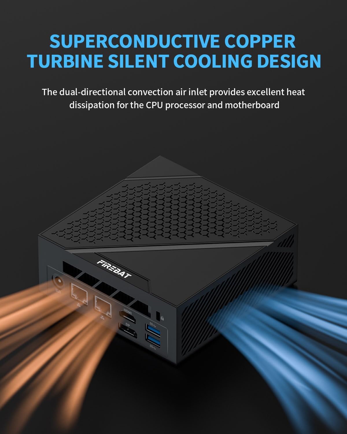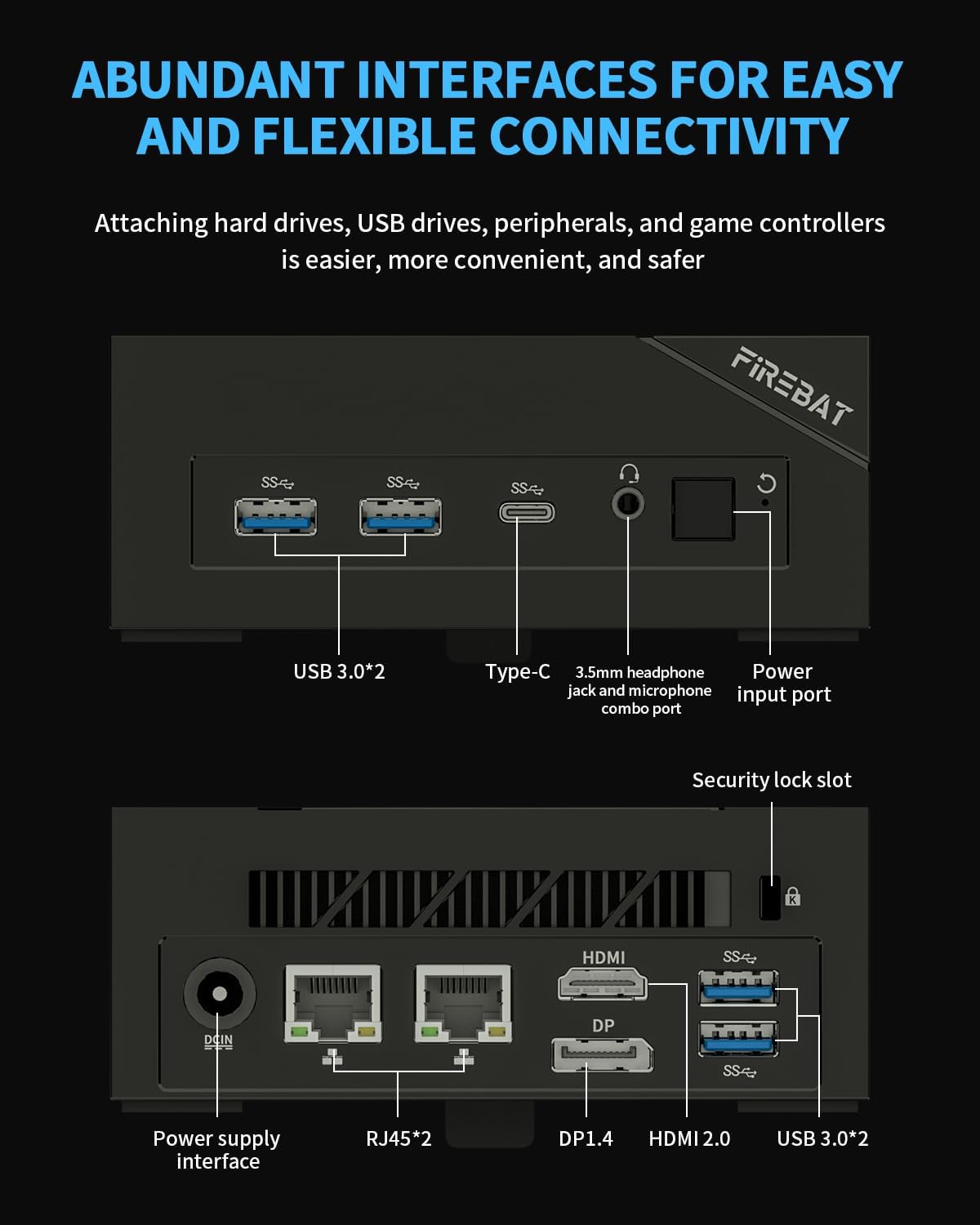 Full-Featured Type-C – The FIREBAT mini PC comes with a full-featured Type-C interface, offering direct connection and plug-and-play functionality. With a single Type-C data cable, it can power the small host while also providing power and display signal output, optimizing desktop space and ensuring a tidy workspace. The robust full-featured Type-C supports transfer speeds of up to 10Gbps, along with video output and power supply capabilities. Adding a VESA mount allows you to hide the mini PC behind a monitor or HDTV, keeping your desktop clean and organized to the maximum extent possible.