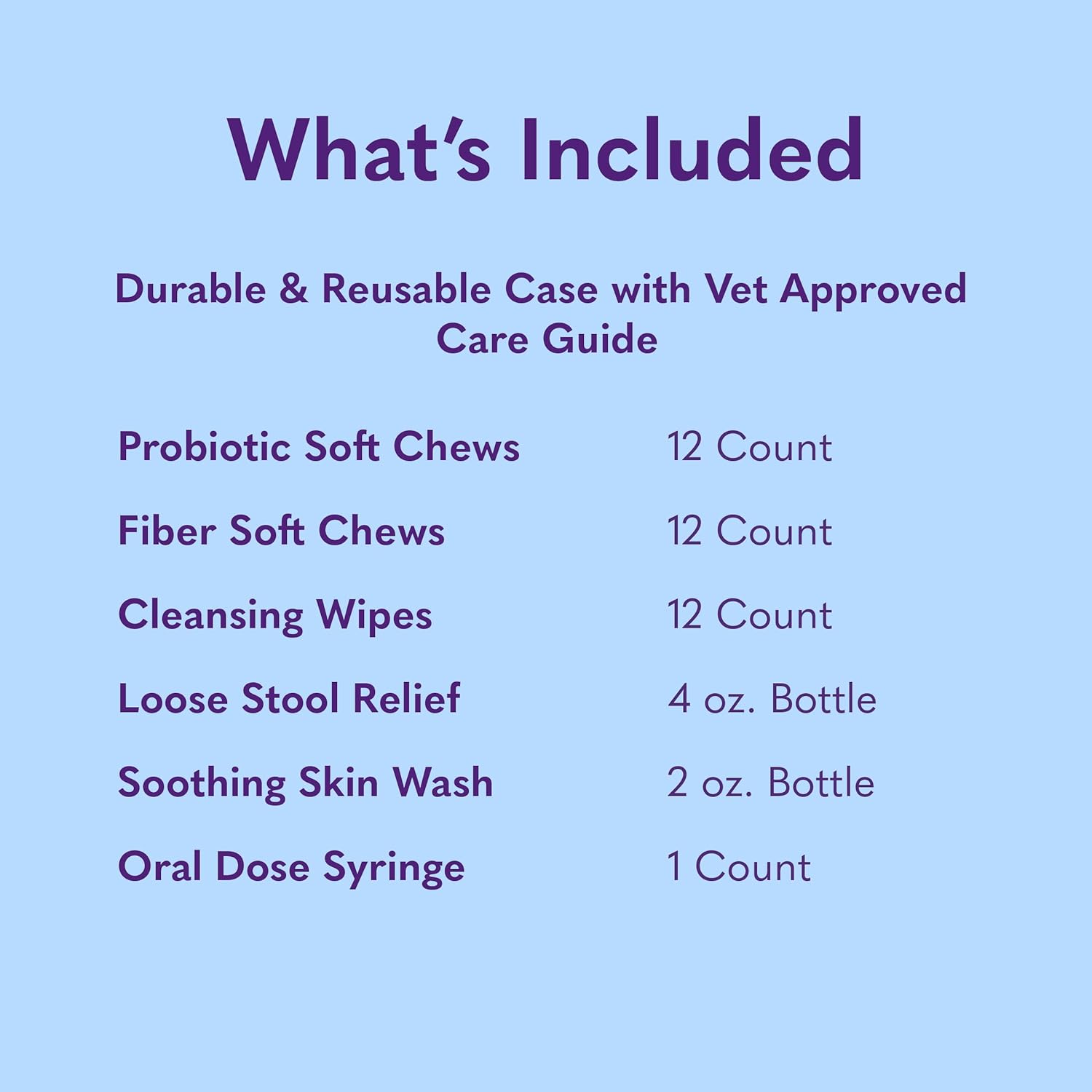 INCLUDES EVERYTHING YOU NEED: Vet recommended Care Guide, Loose Stool Relief (oral anti-diarrheal liquid), Probiotic Soft Chews (supports digestive health), Fiber Soft Chews (supports normal bowel function), Soothing Skin Wash (cleans soiled haircoat and skin), cleansing wipes, an oral dose syringe, and a durable reusable case. All products are vet-recommended , effective and safe for your pet.