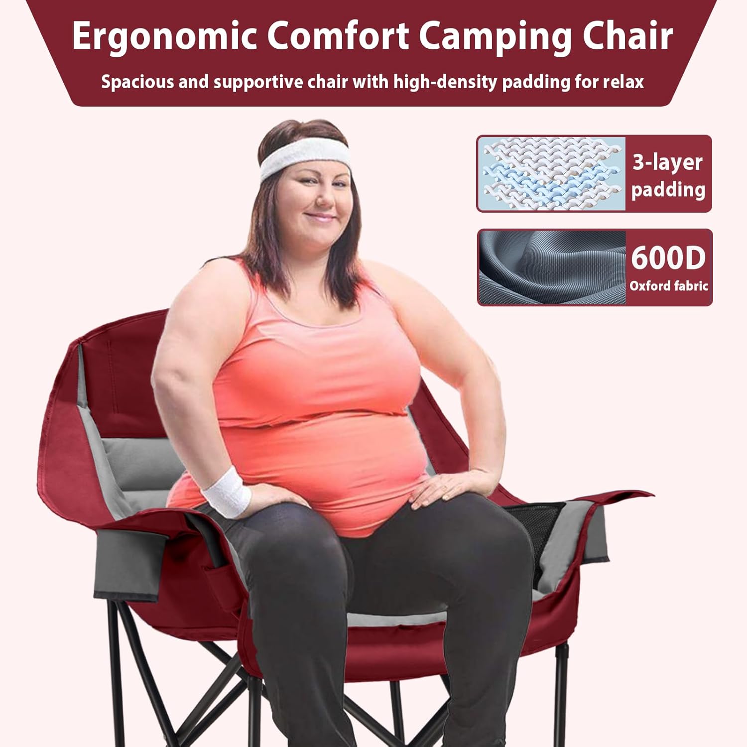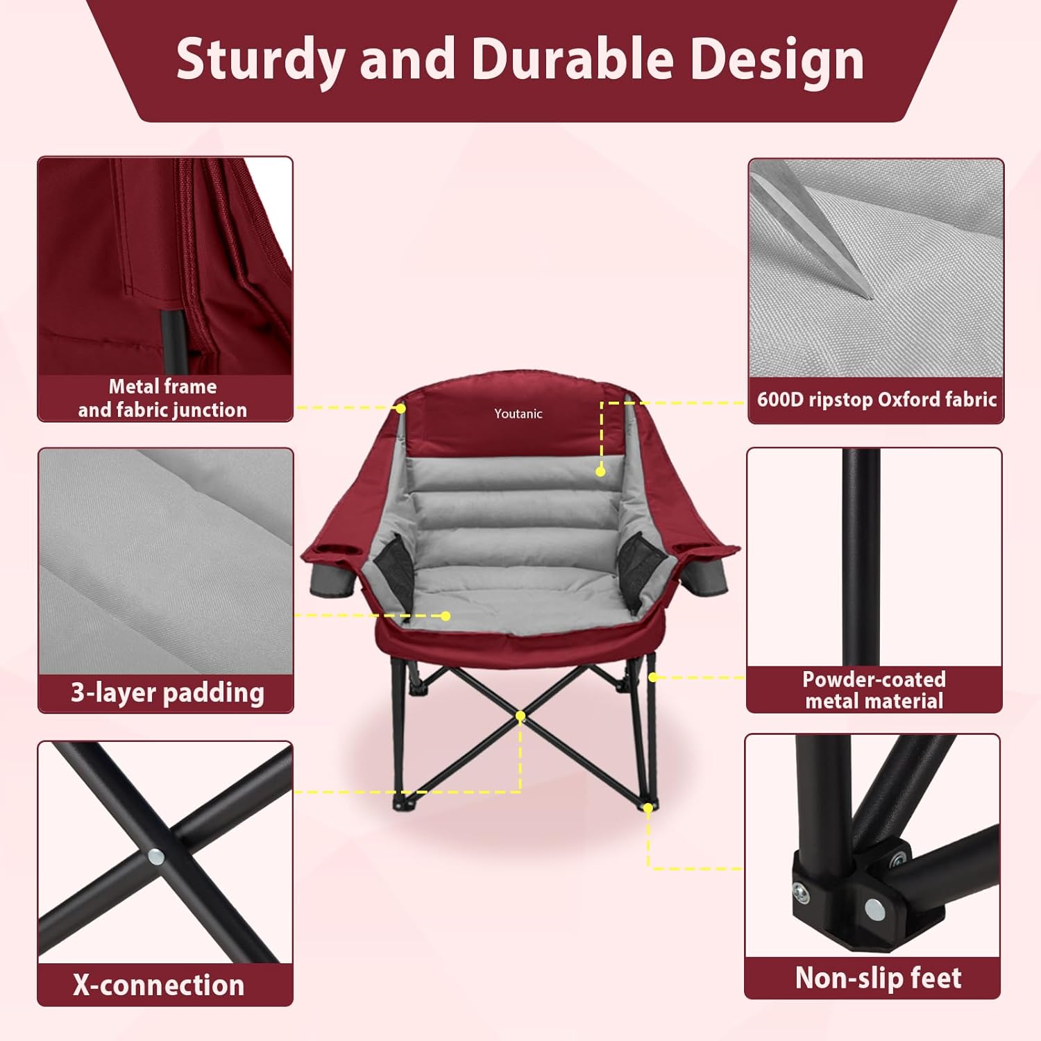 🛤Extremely Comfortable: Our camping chairs for adults heavy duty, designed with ergonomic principles, feature spacious seats with unfolded dimensions of 40.5”L x 28”W x 39”H. The Camping Folding Chair is filled with high-loft, high-density padding in areas such as the headrest, backrest, armrests, and seat cushion, providing ample space and support for your head, neck, back, waist, and hips. This ensures a comfortable experience even during prolonged sitting.