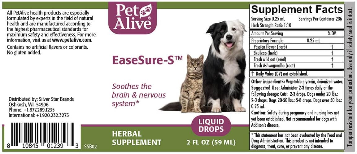SAFE & EFFECTIVE – EaseSure-S contains a scientifically chosen selection of ingredients known to support soothed nerves and your pet’s natural equilibrium. Using a unique, therapeutic blend of Passion Flower, Skullcap, Wild Oat Seed and Ashwagandha in a concentrated liquid formula, EaseSure-S provides support for nervous system health, stability, and brain functioning in dogs and cats.RELIEVES SYMPTOMS – EaseSure-S is a safe and effective, non-addictive, herbal supplement. Formulated by our team of experts in natural medicine to promote brain and nervous system functioning in dogs and cats, EaseSure-S supports symptoms commonly associated with seizures, or stress-related episodes in pets with overactive nervous systems.EASY TO USE – EaseSure-S is a concentrated tincture formula and can be given directly via drops in the mouth using the included dropper.