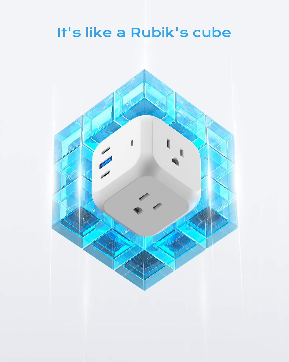 6-In-1 power strip cube, 3 AC outlets, 3 USB charger (2 USB C), deal for cell phones, tablets, power banks, and other electrical chargers.