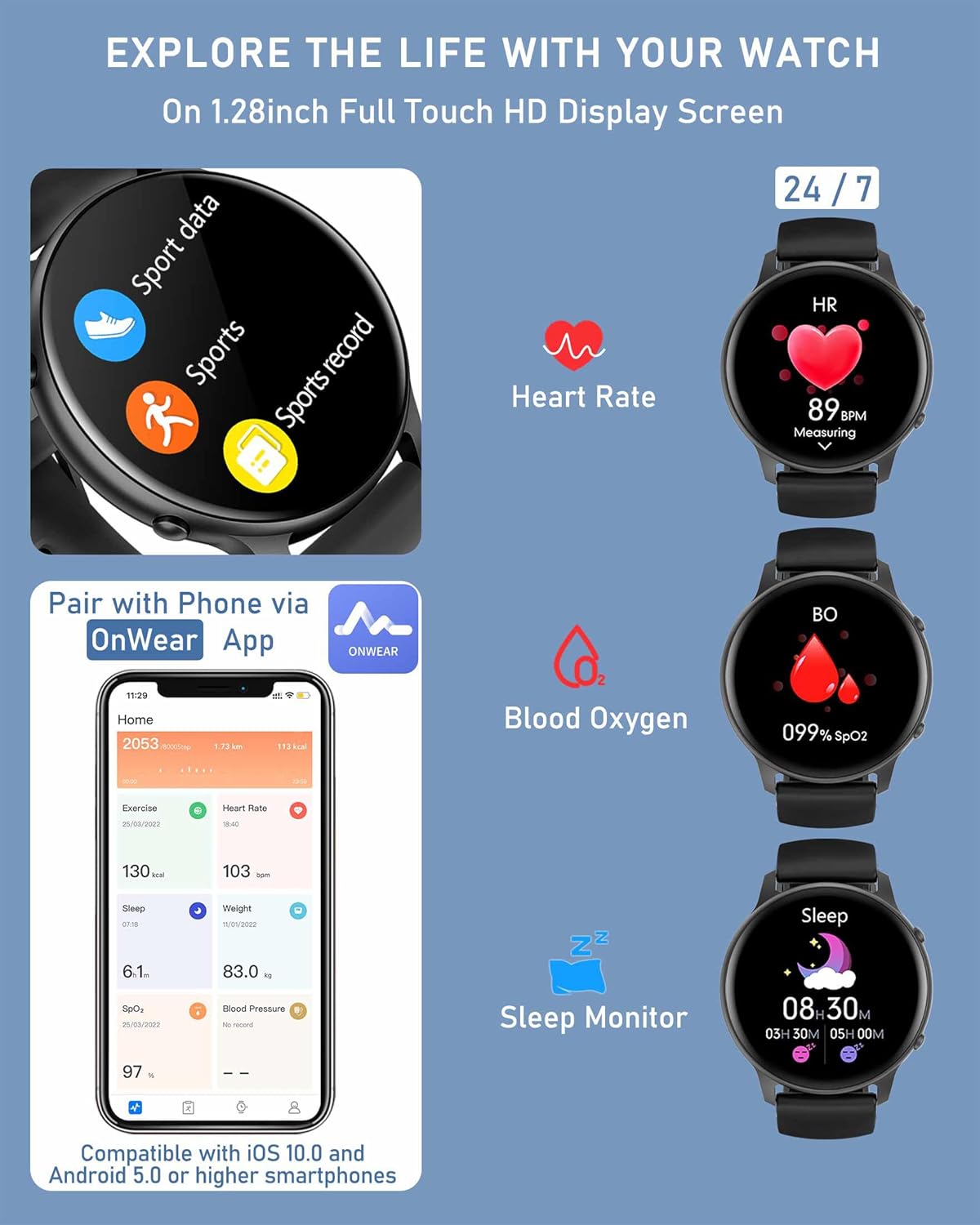 Fitness Watch Tracker for 8 Sports Mode: Accurately records all-day activities like steps, calories, and miles walked, also supports 8 sports, such as walking, running, cycling, hiking, swimming, yoga, etc. The health smartwatch can monitor your sleep status and provide analysis on the APP [OnWear]