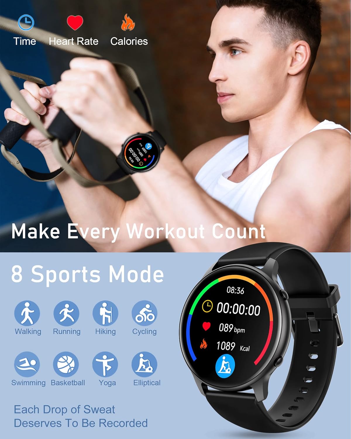 Round Smart Watches for Men Women, 2023 HD LCD Smartwatch iPhone/Samsung Compatible, 3ATM Waterproof Fit Watch Monitor for HR, SPO2, Sleep, Activity Tracker w/Steps, Calories