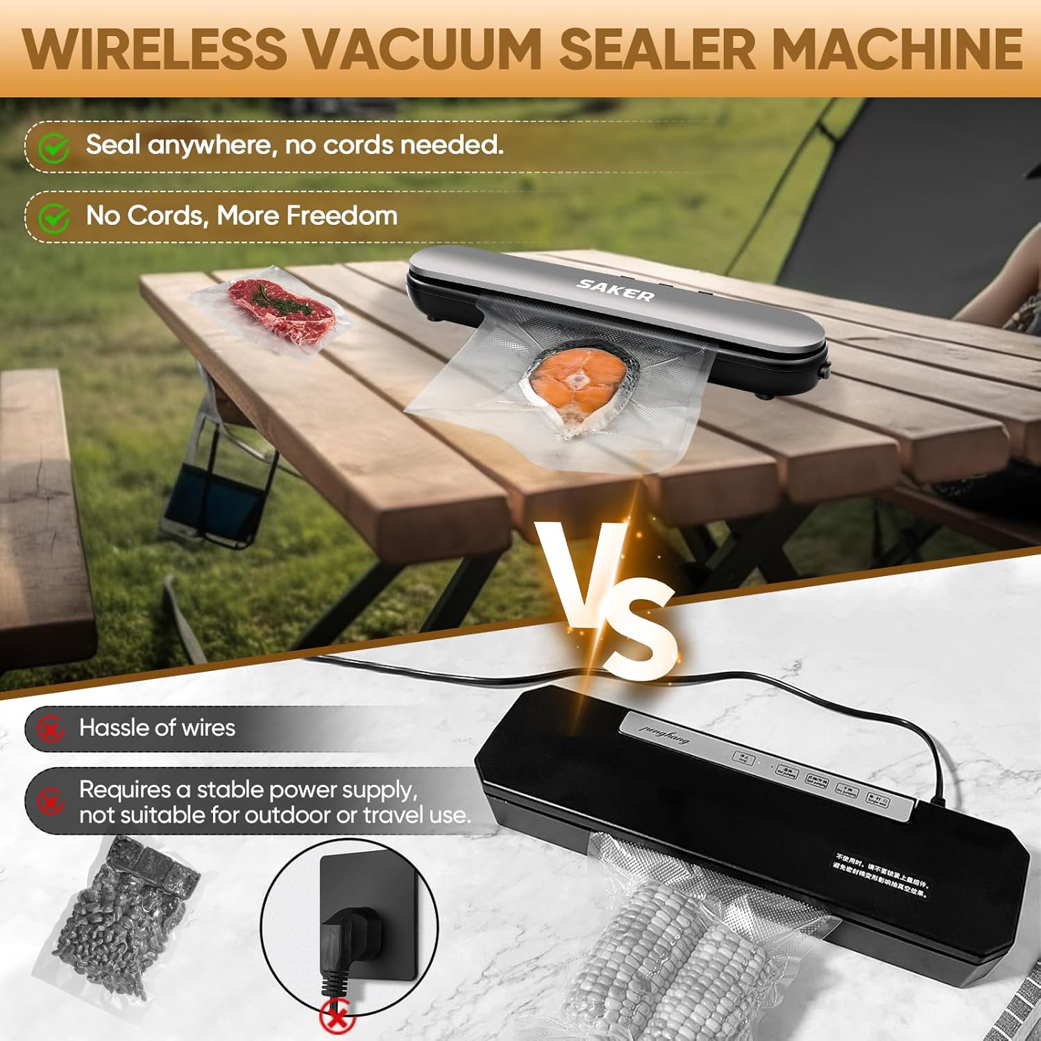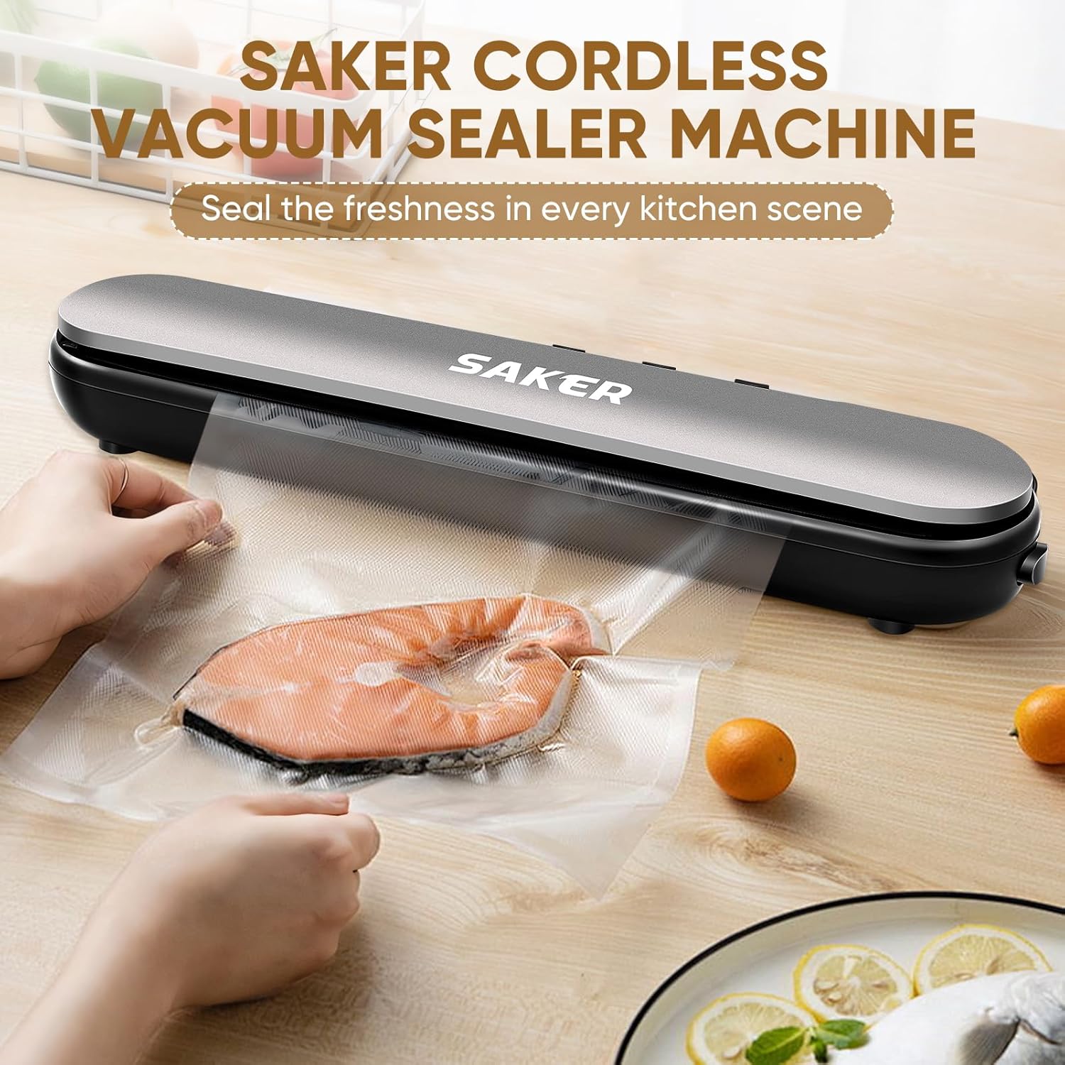Saker Vacuum Sealer Machine,Lithium Cordless Food Vacuum Sealer,Compact Powerful Automatic Vacuum Sealer for Food with Vacuum Bags&Build-in Cutter,Portable for Better Food Preservation Outdoors