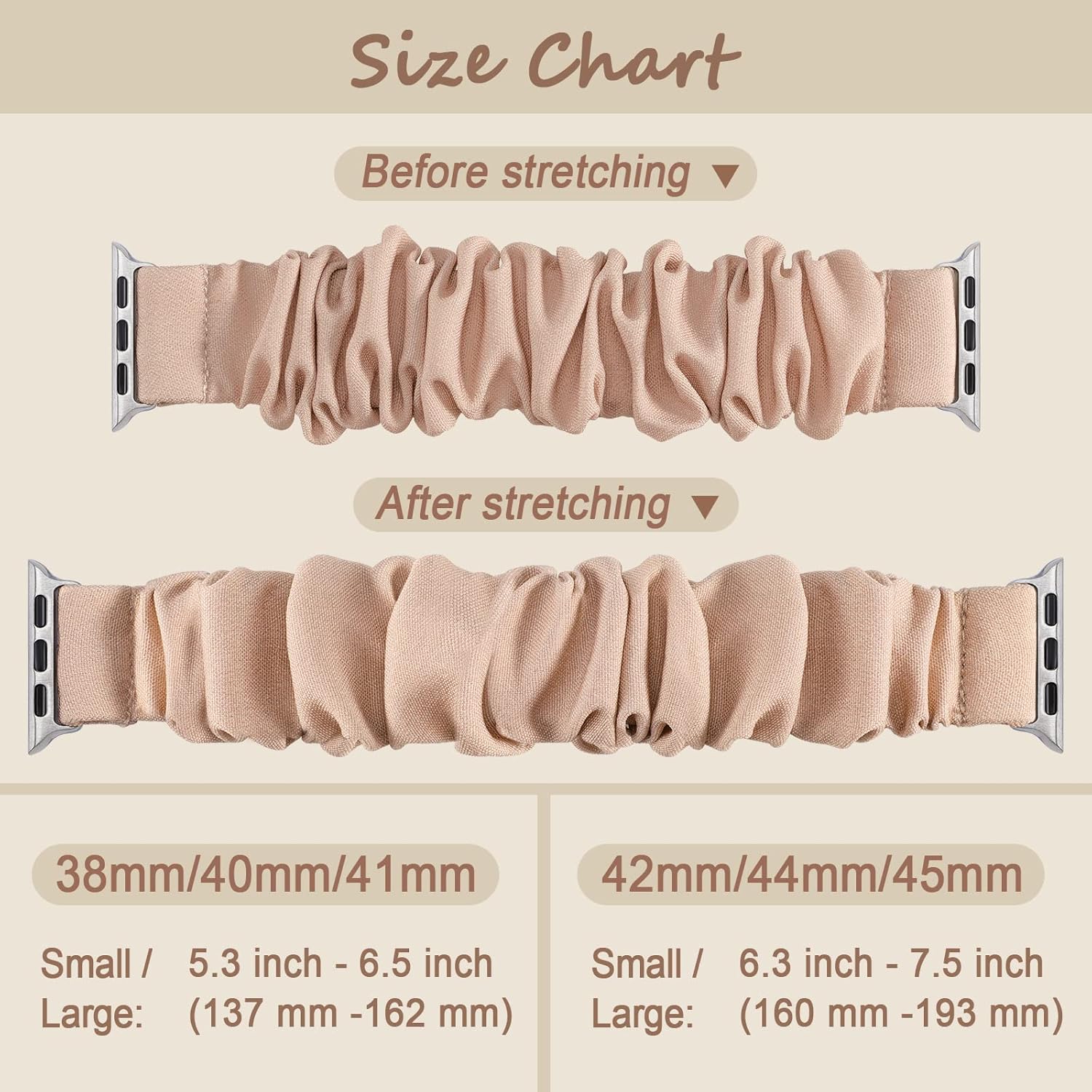 Small / Large: 38mm/40mm/41mm Size fits for 5.3″-6.5″ (137mm-162mm) wrist; Small / Large: 42mm/44mm/45mm Size fits for 5.9″ – 7.9″ (160mm-193mm) wrist.