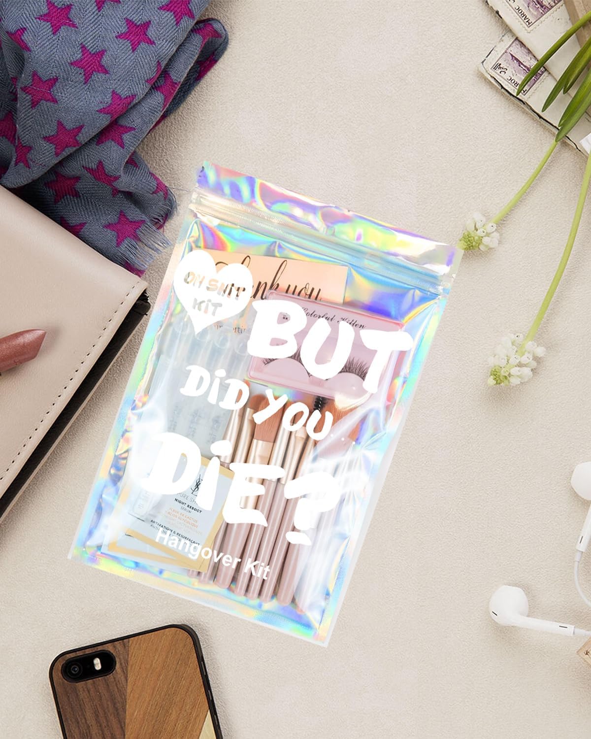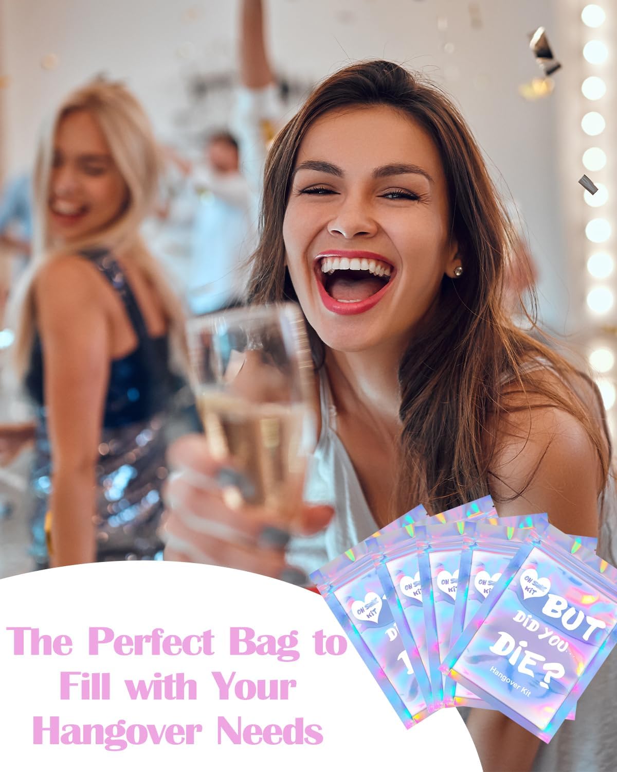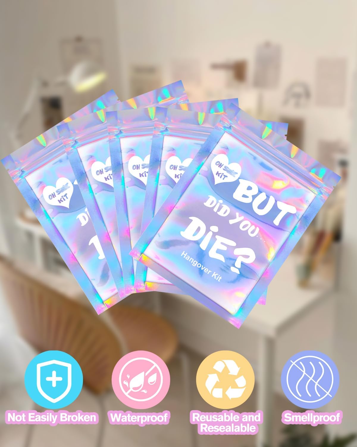 HANGOVER KIT BAGS: 20/50 pack 5”x7” inch empty hangover bags with a beautiful laser appearance printed with “BUT DID YOU DIE?”, perfect size and stylish appearance for your party needs.
