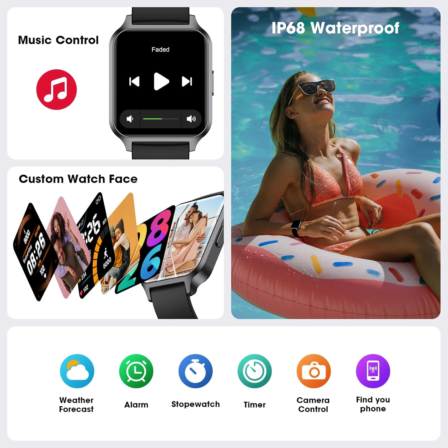 Swim-Ready and Waterproof: With an IP68 waterproof rating, this smart watch is suitable for swimming and can withstand water immersion. Note: Not recommended for deep-water activities.