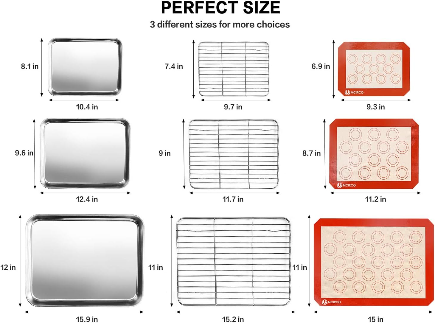 SUPERIOR CRAFT & DESIGN: Our stainless steel cookie sheets are highly mirror polished to reduce the risk of food sticking and to release food easily; Smooth roll rims make it comfortable to hold. Each stainless steel rack with tight grid has four raised feet, keeping meat lifted above juice and easily release. With dense parallel lines, keep food from falling. Each roasting rack and baking mat perfectly fits in the baking pans.