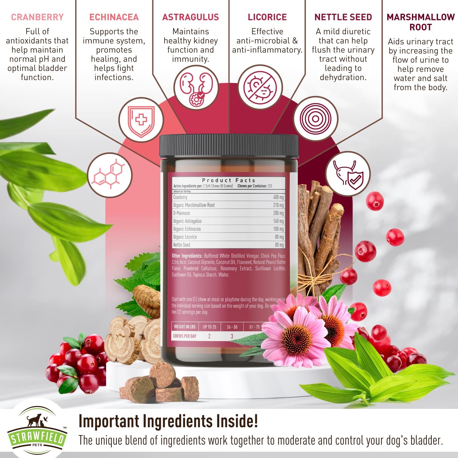 Strawfield Pets Cranberry+ UTI Bladder Chews for Dogs Prevent Urinary Tract Problems & Support Digestion Strawfield Pets Cranberry+ UTI Bladder Chews for Dogs is a supplemental treat that helps urinary tract, kidney and bladder health. Our jars contain 120 Grain Free allergy-free peanut butter flavored treats—carefully crafted for small, medium, large & adult and senior dogs. These tasty treats feature 400 mg of extra strength Cranberry & D-Mannose to flush out bad bacteria, prevent UTI bladder infections, and support a healthy PH for bladder function. Organic Marshmallow Root, Echinacea & Astragalus help flush toxins out of the bladder, while Licorice and Nettle Seeds flush the kidneys. Made in the USA Our chews are crafted in the USA in a Federally Regulated Laboratory that is NASC certified.