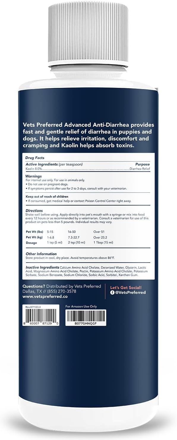 Vets Preferred Anti Diarrhea Liquid for Dogs – Dog Diarrhea Relief with Pectin and Kaolin (8 oz.) | Once every 12 hours for Dog Diarrhea & Dog Gas Relief