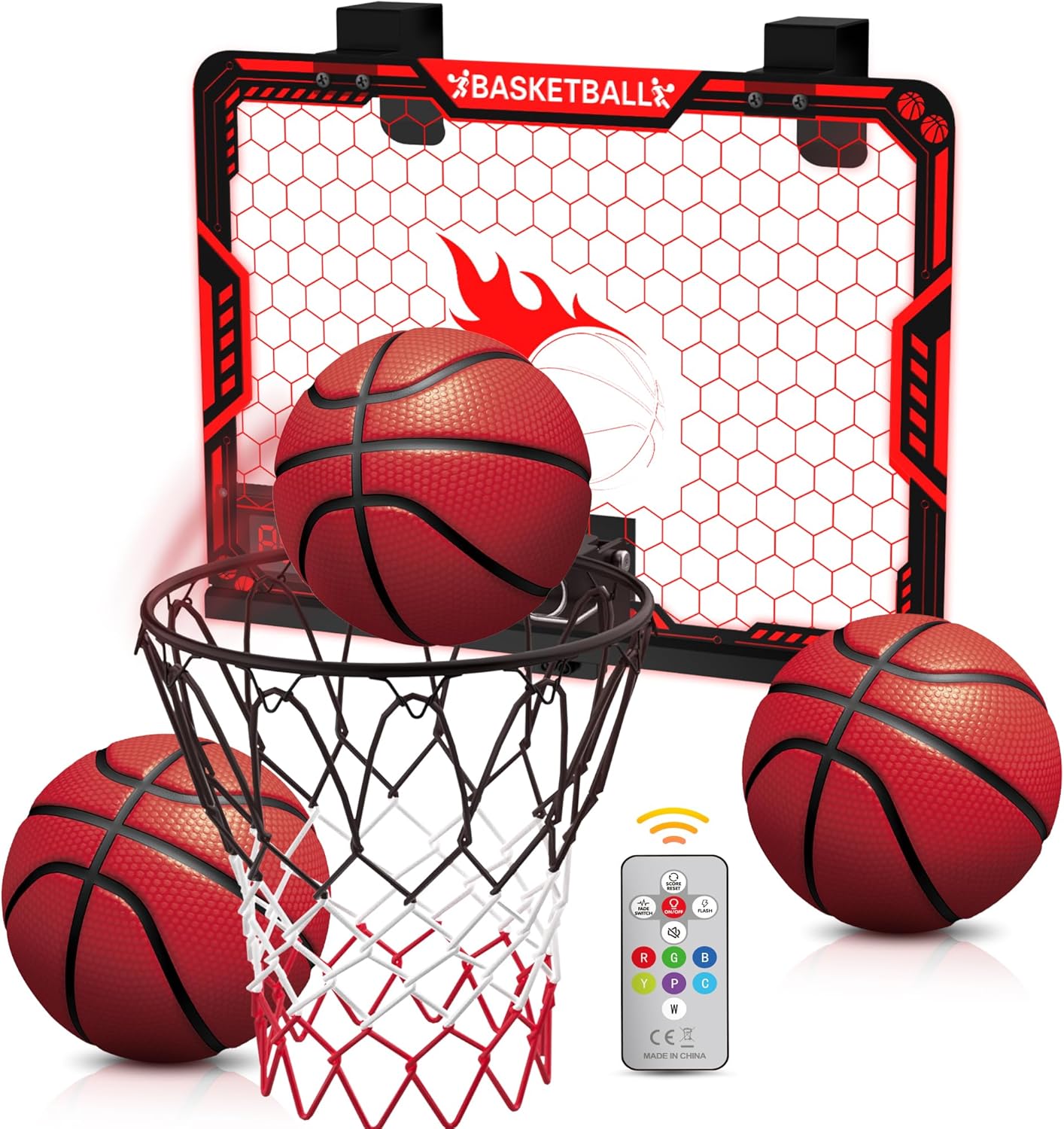 ZIZZ Indoor Basketball Hoop for Kids: LED Light & Electronic Scoreboard Over The Door Basketball Hoop with 3 Ball Mini Basketball Hoop Game Birthday Toys Gift for Ages 5 6 7 8 9 10 11 12 Years Old Boy